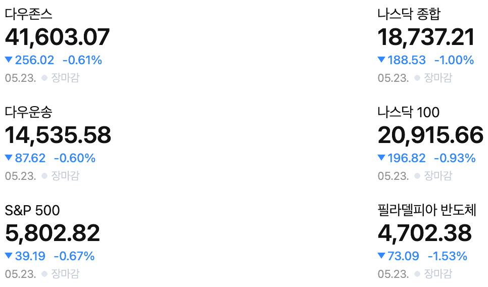 간밤(현지 5/23) 뉴욕증시는 일제히 하락 마감했습니다. 다우지수는 41,603.07로 -0.61% 하락했고, S&P500 지수도 5,802.82로 -0.67% 내렸습니다. 기술주 중심의 나스닥 종합지수는 18,737.21로 -1.00% 급락하며 주요 지수 중 낙폭이 가장 컸습니다. 특히 대형 기술주에 악재가 집중되며 나스닥100 지수도 -0.93% 하락했고, 필라델피아 반도체지수는 -1.53% 급락하여 반도체株 전반의 부진을 나타냈습니다. 이는 전날 실적 호조로 한때 상승했던 엔비디아 등도 장 후반 하락 반전했음을 보여줍니다. 유럽 증시 역시 무역분쟁 우려에 동반 급락해, 독일 DAX와 유로스톡스50 지수 등이 1~2%대 하락을 기록했습니다.