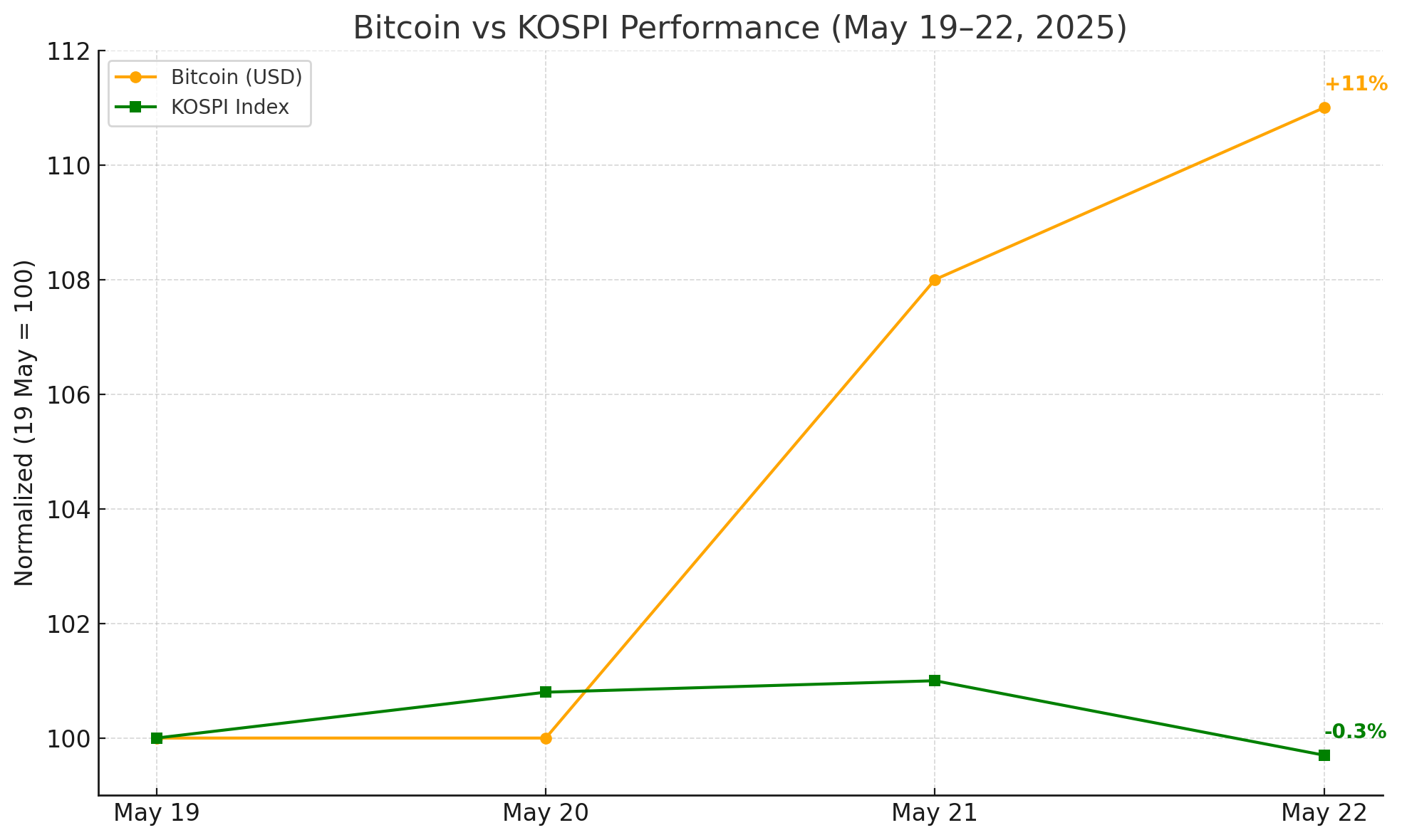 비트코인 가격(주황색)과 코스피 지수(녹색)의 5월 19일~22일 상대적 변동 (% 기준). 증시 부진 속에서도 비트코인이 강한 상승 탄력을 보였다.
