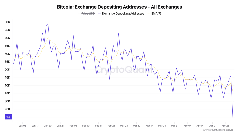 차트: 비트코인 거래소 입금 주소 수(파란선)가 최근 수개월간 꾸준히 하락 중이며, 2025년 4월 말 현재 1.9만 개 수준으로 과거 대비 매우 적은 수치입니다(주황선은 7일 EMA). 이는 매도 압력 감소 신호입니다.