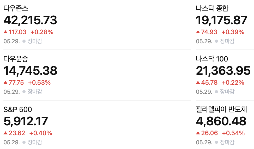 미국 증시는 혼조세 끝에 상승 마감했습니다. 간밤 다우존스 산업평균지수는 42,215.73포인트로 +0.28% 상승했고, S&P500은 5,912.17로 +0.40% 올랐습니다. 기술주 중심의 나스닥 지수도 19,175.87로 +0.39% 상승하며 5거래일 만에 반등에 성공했습니다. 미국 시장에서는 엔비디아의 깜짝 실적 발표에도 불구하고 전일에는 차익 실현 매물이 출현하며 잠시 조정받았으나, 29일(현지시간)에는 트럼프발 관세 철회 소식과 금리 인하 기대감에 매수세가 선행되어 지수가 반등했습니다. 다우와 S&P500 지수는 사상 최고치 부근에서 추가 상승을 이어가고 있고, 나스닥은 AI 관련 대형 기술주 강세로 강한 탄력을 받는 모습입니다.