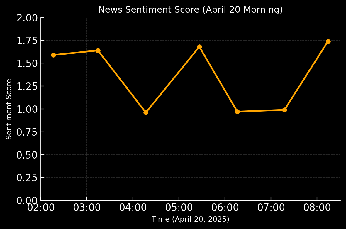 금일(4월 20일) 새벽 시간대 뉴스 흐름에 따른 시장  심리 점수  변화 추이. 긍정적인 전망 뉴스가 나오면 점수가 높아졌다가, 규제 이슈 등 부정적 소식에 일시적으로 급락하는 등 투자 심리가 시간대별로 큰 변동을 보였다.