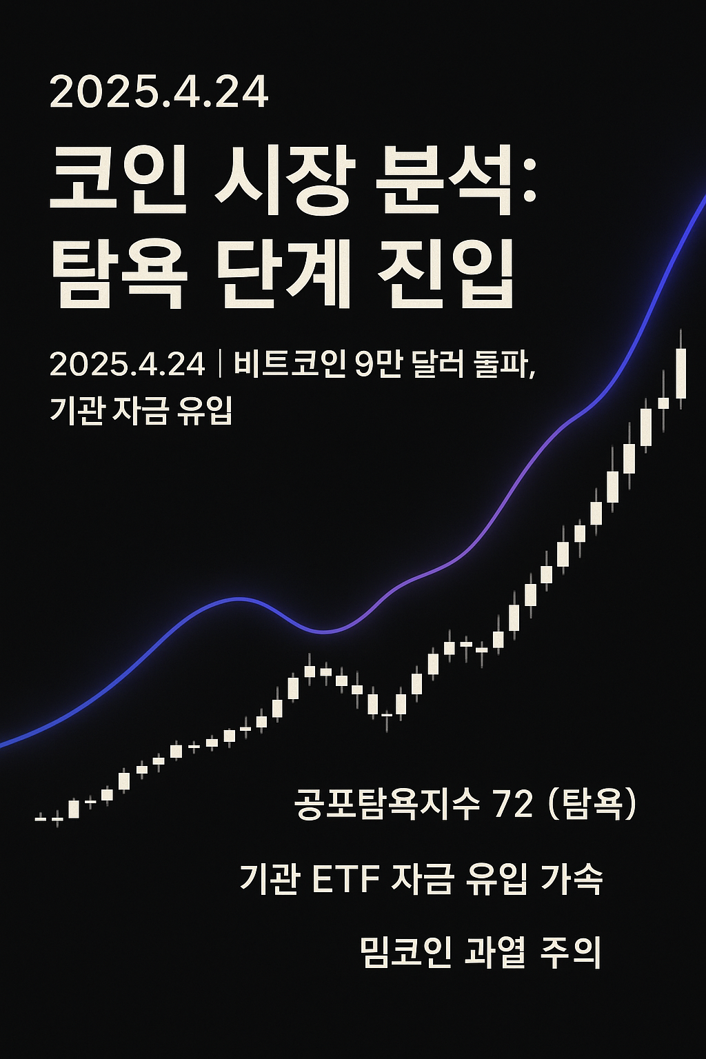 2025년 4월 24일 코인 시장 분석: 기관 자금 유입 속 투자심리 '탐욕' 단계… 밈코인 과열 주의