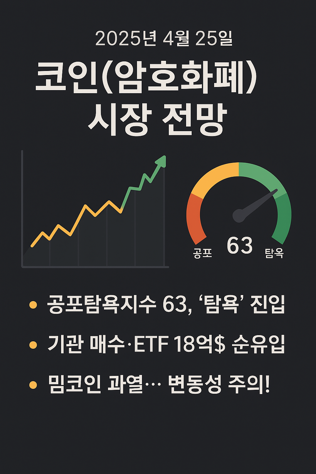 코인 시장은 공포탐욕지수 ‘탐욕’ 구간으로 진입하며 기관 매수세가 두드러지고 있습니다. 오늘의 시장 전망과 AI 기반 분석 결과, 주목할 코인과 투자 유의사항을 종합해 알아봅니다.