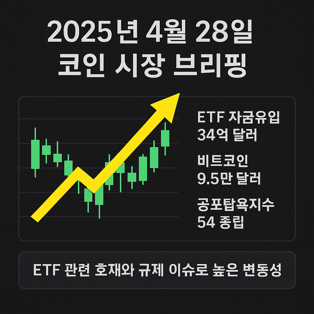 2025년 4월 28일, 글로벌 암호화폐 시장은 ETF에 의한 자금 유입 기대와 주요 규제 이슈가 상충하며 높은 변동성을 보였습니다. 오늘의 브리핑에서는 비트코인과 이더리움 등 주요 암호화폐의 시세 흐름과 함께 최근 투자심리 지표인 공포탐욕지수 변동을 분석합니다.
