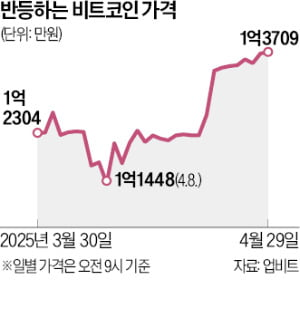3월 말 업비트 기준 비트코인은 약 1억 2304만원(3월 30일)에서 4월 말 1억 3709만원(4월 29일)까지 상승했다.