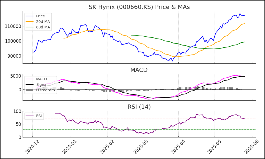SK하이닉스 주가는 연초 대비 크게 반등하여 현재 11만 원대를 회복한 상황입니다. 20일선과 60일선의 골든크로스가 4월 중순에 발생한 후 단기 조정을 거쳤으나, 5월 들어 AI 반도체 수요 급증 기대에 힘입어 가파른 상승세를 보였습니다. 기술적으로 RSI 지표는 70 안팎까지 올라와 있어 단기 과매수 신호가 포착되고 있습니다. 최근 며칠 사이 RSI가 70을 살짝 웃돌며 과열권에 진입했다가 현재 약간 내려온 상태로, 단기 숨고르기가 나올 수 있음을 시사합니다. MACD 지표를 보면 5월 초에 골든크로스(MACD선의 시그널선 돌파)가 발생한 이후 쭉 양의 영역에서 MACD선(자주색)이 신호선보다 위에 위치해 있습니다. 이는 상승 모멘텀이 유지되고 있음을 의미하며 히스토그램 막대도 대부분 양(+)의 값을 나타냈습니다. 다만 5월 말 들어 MACD 히스토그램 크기가 다소 줄고 MACD선과 신호선의 간격이 좁아지는 모습이 보여, 단기 상승 탄력이 정점 대비 약해질 가능성도 염두에 둬야 합니다【66†】. 종합하면 SK하이닉스는 추세적 상승을 이어가고 있으나 단기 과열 부담이 있는 상태로, 조정 시 10만 5천원대 안팎의 60일선 지지력을 확인하며 대응하는 전략이 유효해 보입니다.