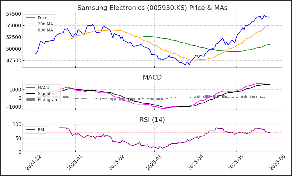 삼성전자 주가는 지난 몇 달 간 저점 대비 완만한 상승 추세를 이어오며 20일선(주황선)이 60일선(녹색선)을 아래에서 위로 뚫는 골든크로스가 4월 초 발생했습니다. 이는 중기 추세 전환의 긍정 신호로 해석됩니다. 이후 단기 조정에도 불구하고 주가는 5월 들어 뚜렷한 우상향을 보이며 5만6천원 선까지 회복했습니다. RSI(14) 지표는 현재 65~70 부근으로 과매수 임계치에 근접해 있어 단기적으로 숨 고르기 가능성도 염두에 두어야 합니다. 한때 RSI가 70을 넘기도 했지만 최근 살짝 내려오며 과열 신호를 소강상태로 만들었습니다. MACD 역시 5월 중순 이후 MACD선(자주색)이 신호선(검정색) 위에서 꾸준히 상승함으로써 상승 모멘텀 유지를 시사합니다. 다만 히스토그램 막대가 다소 줄어들고 있어 상승 탄력이 정점 대비 약간 둔화될 조짐도 보입니다【65†】. 전반적으로 기술적 지표들은 삼성전자가 단기 과열권에 진입했다가 살짝 완화된 강세 상태임을 보여주며, 향후 조정이 오더라도 20일 이평선(약 5만3천원대) 지지 여부를 확인하면서 추세가 이어질지 관찰할 필요가 있습니다.