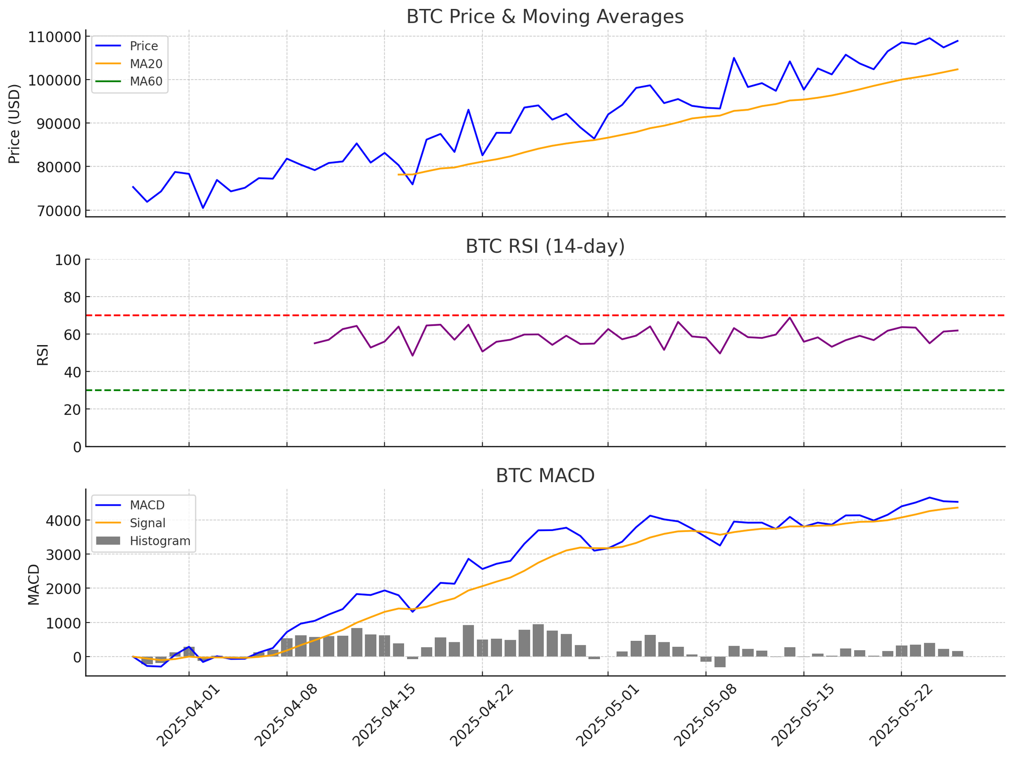 비트코인 가격의 기술적 지표 (일봉 기준): 상단 차트는 BTC/USD 가격 추이(파란색)와 20일 이동평균선(주황색), 60일 이동평균선(녹색)을 나타낸다. 중단은 14일 RSI(보라색)로, 70 이상 과매수(빨간 점선) 구간에서 현재 하락하여 50~60 부근을 유지하고 있다. 하단은 MACD 지표로, 파란 MACD선이 신호선(주황색) 위에 위치해 있으나 그 폭은 줄어드는 추세이다.