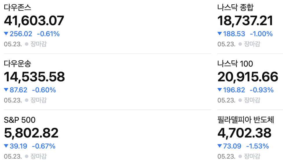 미국 증시 주요 지수 (5월 23일 종가 기준): 다우존스 산업지수 41,603.07(-0.61%), 나스닥 종합지수 18,737.21(-1.00%) 등 주간 마지막 거래일에 소폭 하락 마감했다.